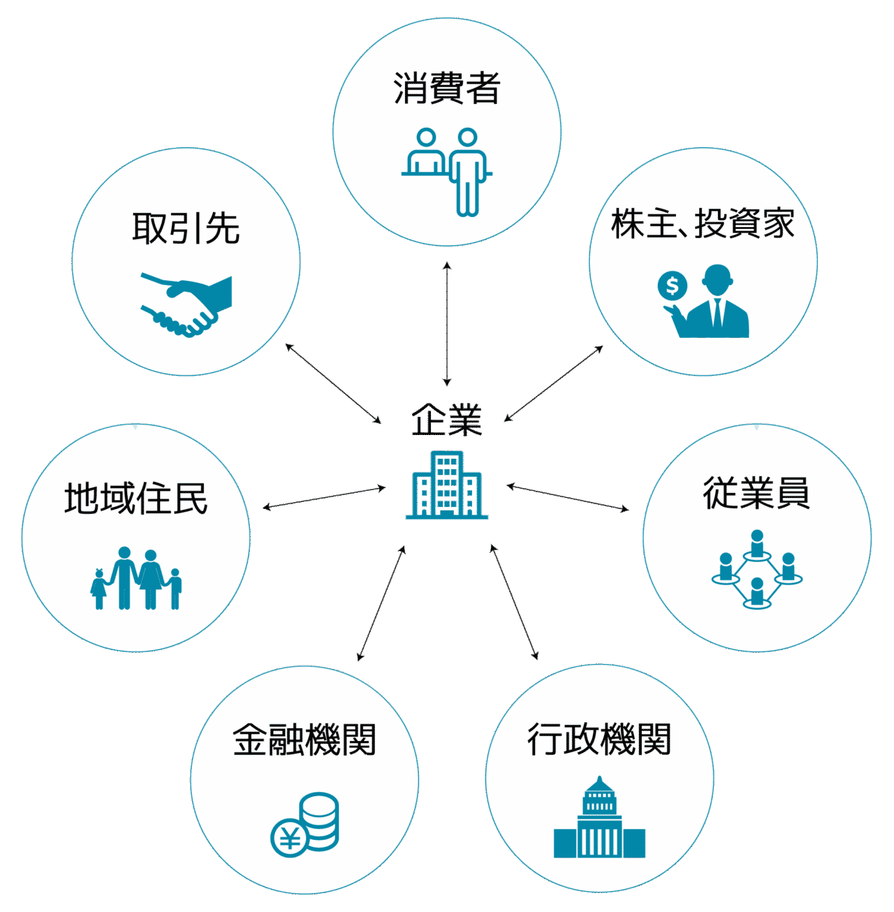 企業を取り巻くステークホルダーには、消費者、株主・投資家、従業員のほか、行政機関や金融機関、地域住民や取引先などがある。消費者への製品情報から従業員向けの社内広報、株主・投資家向けのIR(Investor Relations)まで、さまざまなステークホルダーと情報を共有し、相互の信頼関係を構築することが求められているのである。