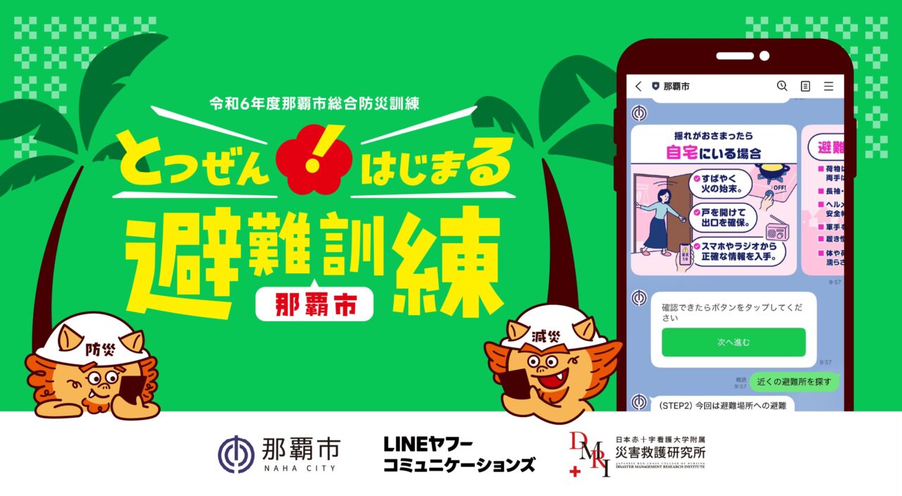 度重なる災害で一層の防災意識が高まる中、那覇市とLINEヤフーコミュニケーションズは、公民協働でオンライン避難訓練「とつぜんはじまる避難訓練」を実施した。この避難訓練は、LINEを活用した訓練で、参加登録した市民に抜き打ちで「訓練開始」の通知が届き、最寄りの避難所の検索や避難行動の学習ができる仕組みだ。災害は予期できないことから、訓練も予告なしで突然始まる形式にしている。