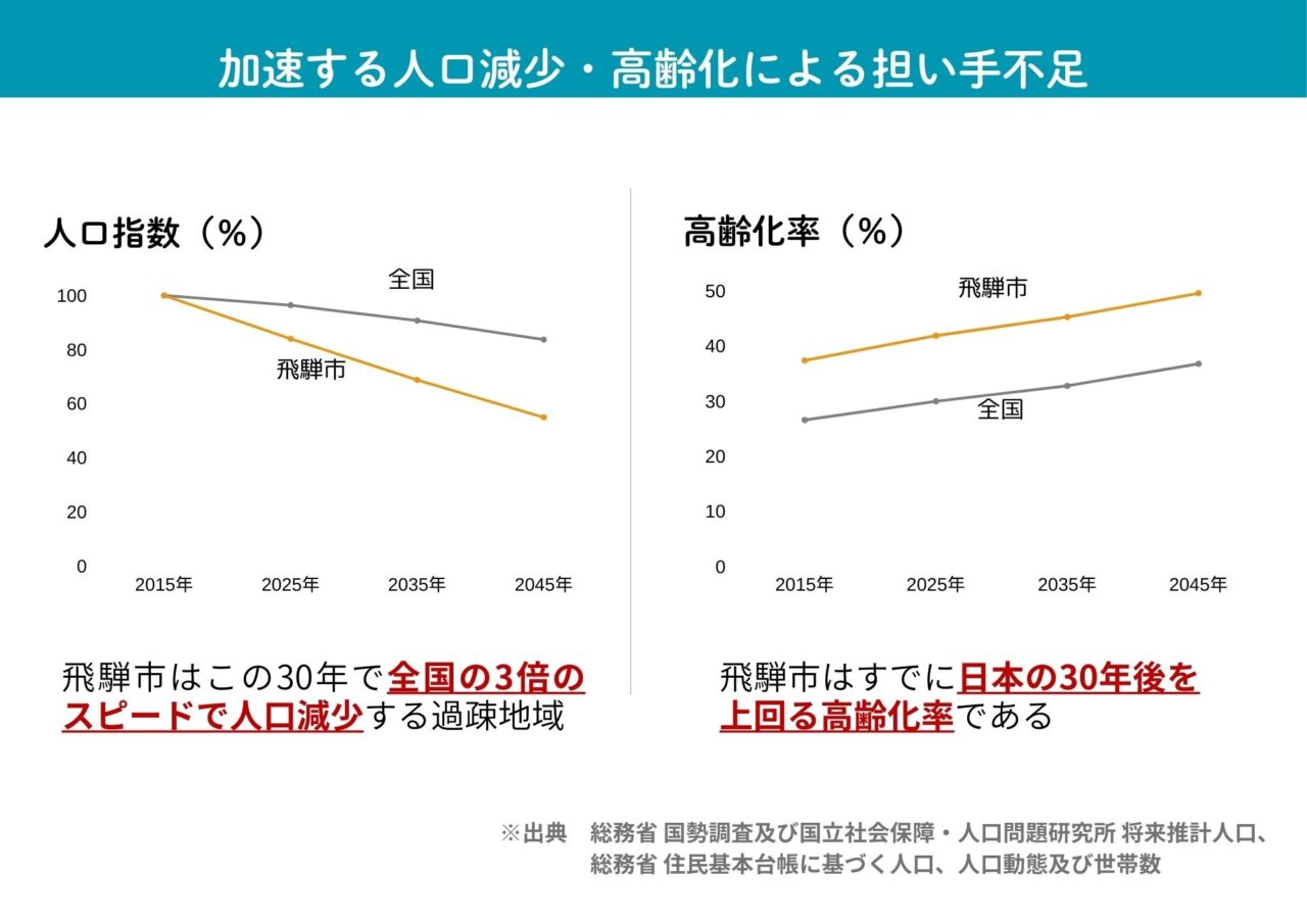 岐阜県飛騨市は、高齢化率40.59%に達し、日本の30年後の未来を先取りする「人口減少先進地」である。2005年からの20年間で人口の約3割にあたる9千人が減少し、現在は約2.1万人。この急激な変化は、祭屋台の曳き手不足や伝統的な農業の停滞、地域活動の担い手不足を招き、住民の間には「この町の将来は大丈夫なのか」「人がいないから諦めるしかない」といった不安と諦めの空気が感じられた。