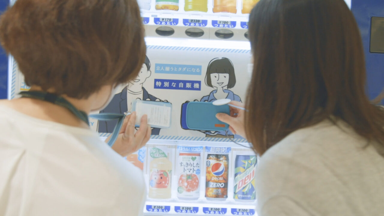 そこで、いつでもどこでも手軽に飲み物が買える自販機を活用して、職場内のコミュニケーションのきっかけを増やせないかと考え、二人揃って社員証を自販機にかざすと、それぞれが飲み物を無料※でもらえる「社長のおごり自販機」を企画した。