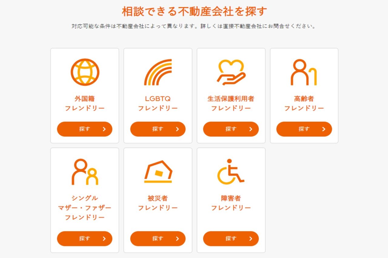 「FRIENDLY DOOR」では外国籍、LGBTQ、生活保護利用者、高齢者、シングルマザー・ファザー、被災者、障害者といったさまざまなバックグラウンドに対して理解があり、住まい探しについて相談できる不動産会社を探せるサイトを提供している。