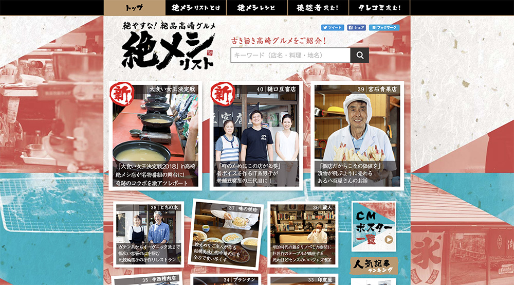 群馬県高崎市はかつては多くの個人飲食店で賑わっていたが、時代の流れとともにその数は次々に減少。全国的に起こっている地方都市問題を抱えていた。「絶メシリスト」は、そんな古くからある町の個人飲食店を「絶メシ」と名付け、“今すぐ食べに行くべき! 希少なグルメ” として紹介していくことで、こうした古い飲食店にもう1度、光を当てるローカルグルメ情報サイトだ。