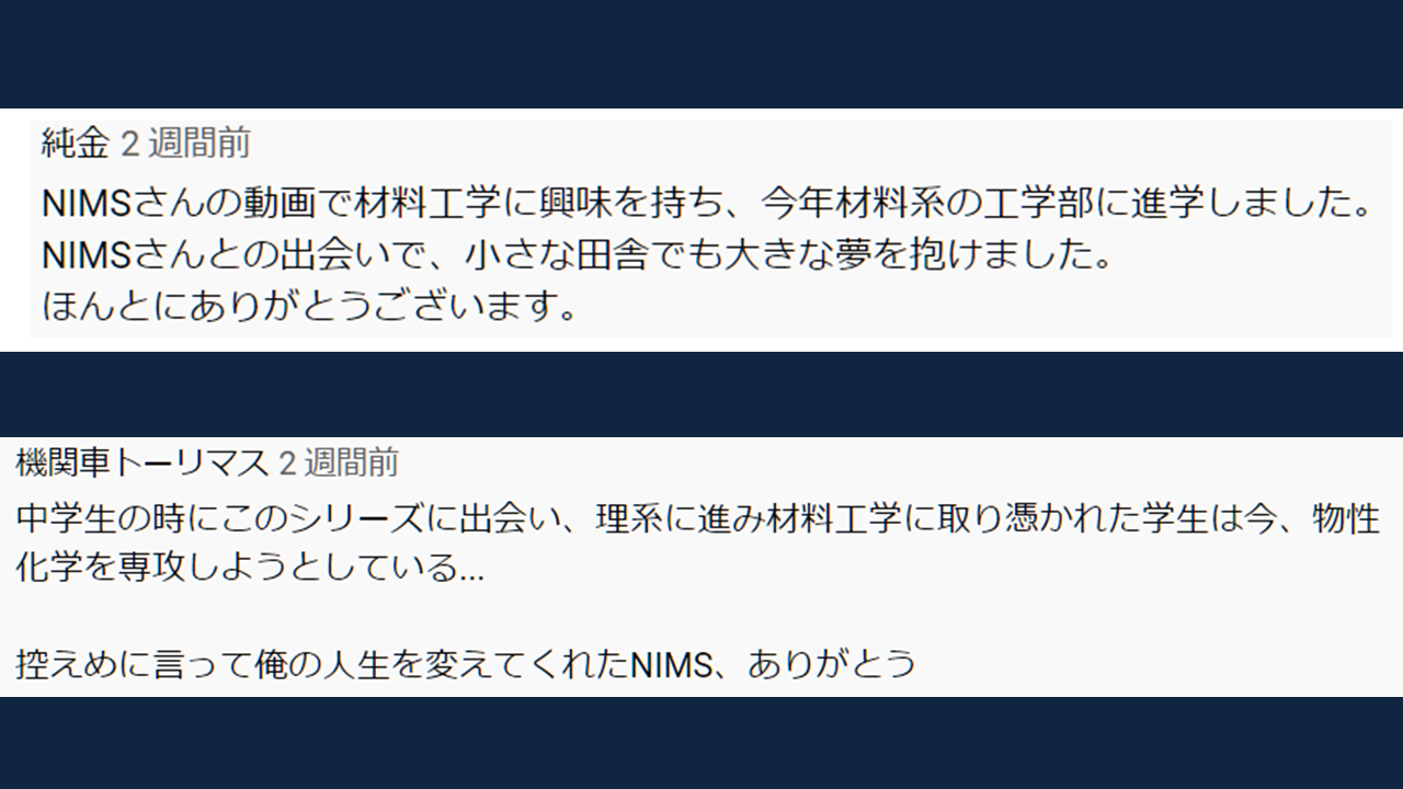 今では、毎年春になると、かつて『まてりある’s eye』を見たことがきかっけでこの分野に興味を持ち、春から材料系の大学に進学が決まったという趣旨の投稿が数多く寄せられる。この現象は、一研究機関の広報活動が若者の人生に影響を与えられることを示す成果といえる。
