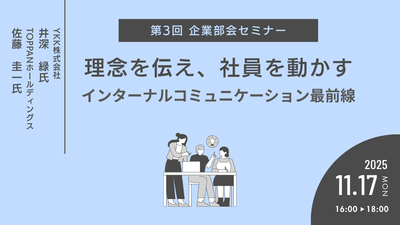 今回のテーマは、「理念を伝え、社員を動かす ― インターナルコミュニケーション最前線」として、YKK株式会社とTOPPANホールディングス株式会社、2社の理念浸透の取組みを実際に牽引しているお二人が登壇。それぞれ事例をご紹介いただきつつ、お互いに聞きたかったことを深堀して語りあう対談パートも用意しました。国内から海外まで、車座集会を粘り強く開催し、直接対話を重視したYKKの取組み。経営体制や社名の変更を機に広報発でPurposeを策定し、世界中の社員が参加した動画や特設サイトで共感を呼び起こしたTOPPANの取組み。対照的に見える2社の取組み事例を知ることで、明日からの自社の活動の参考としていただけるセミナーです。