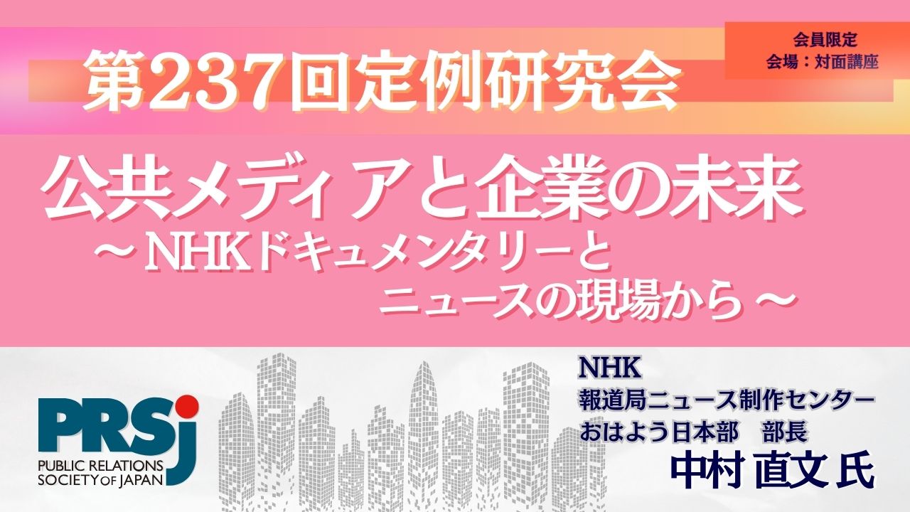 日本パブリックリレーションズ協会は、9月30日(火)に第237回 定例研究会「公共メディアと企業の未来 ~NHKドキュメンタリーとニュースの現場から~」を開催いたします。