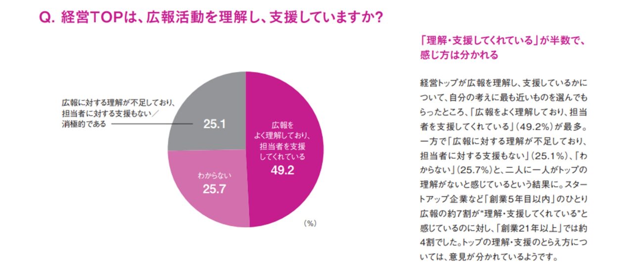 その結果、“ひとり広報”のメリットや悩み、経営トップとの関係が及ぼす影響、今後の広報業務に対する意識などが浮かび上がり、決して単純ではない“ひとり広報”の多様な姿が浮かび上がりました。