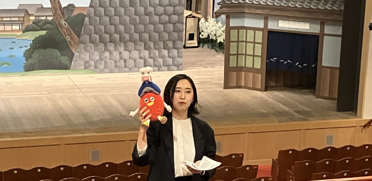 講演会終了後は、石田氏のご案内による南座内のギャラリーツアーを実施。1階から3階の椅子席には快適な鑑賞環境を目的にエアウィーヴとのコラボによるクッションが設置されていることや、ロビーでの企業の商品サンプリング、自治体とのコラボレーションの事例なども紹介されました。